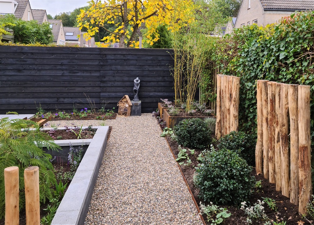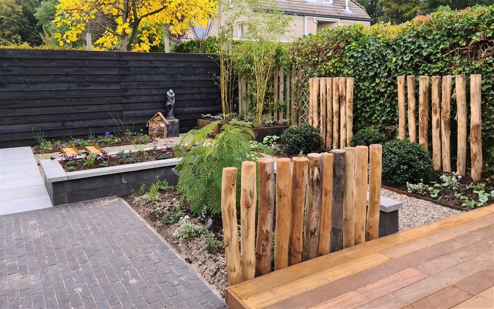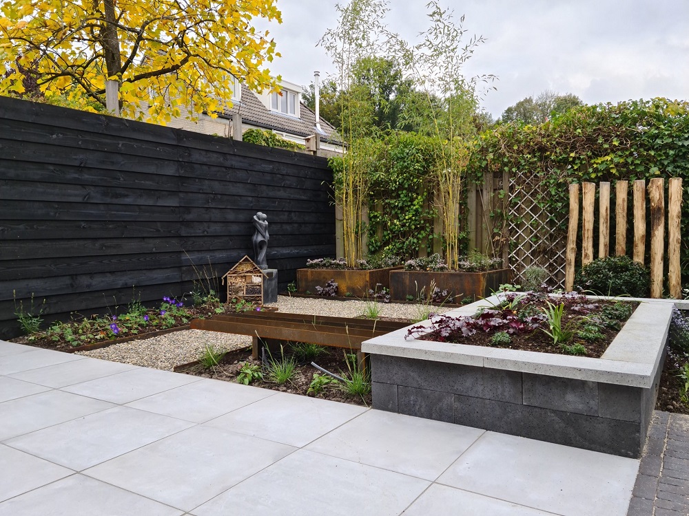 De combinatie van strakke bestrating, subtiele beplanting en duidelijke lijnen maakt deze tuin tot een eigentijdse buitenruimte waar comfort en design samenkomen.