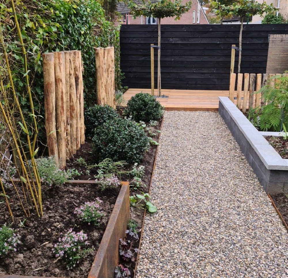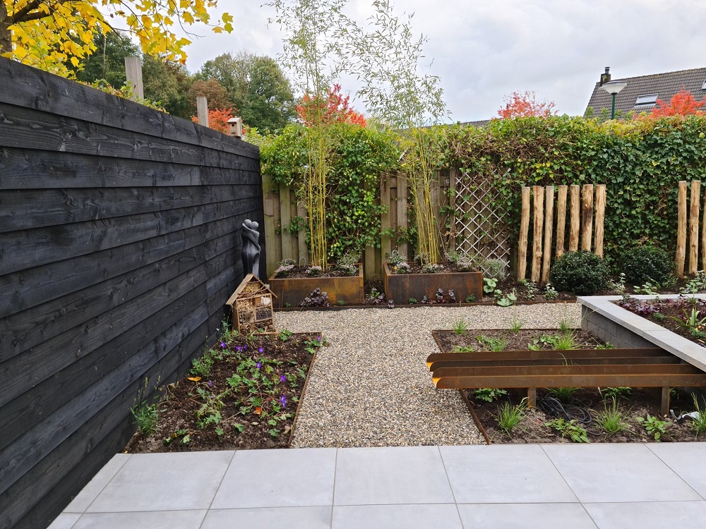 We zijn gestart met het grondwerk en het creëren van een heldere indeling. Grote keramische tegels zorgen voor een strak terras, terwijl verhoogde plantenborders diepte en structuur aanbrengen. Door het gebruik van moderne materialen en een doordachte verlichting ontstaat er zowel overdag als in de avond een sterke uitstraling.